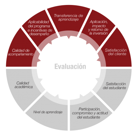 Es un proceso enfocado en los intereses del cliente que incluye la evaluación de la calidad del programa, de los contenidos académicos y su aplicabilidad en el trabajo, y la satisfacción del servicio. Incluye la satisfacción del seguimiento y retroalimentación, así como la evaluación de la transferencia del aprendizaje, sus consecuencias en los resultados organizacionales, y de forma ideal, el retorno de la inversión del programa de educación. Los niveles de evaluación (participación de estudiantes, satisfacción del programa, grado de aprendizaje, aplicación de competencias, impacto en resultados y retorno), se refuerzan con la evaluación de factores ambientales y personales que potencian o limitan la aplicación de las competencias (conocimientos y habilidades) adquiridas.