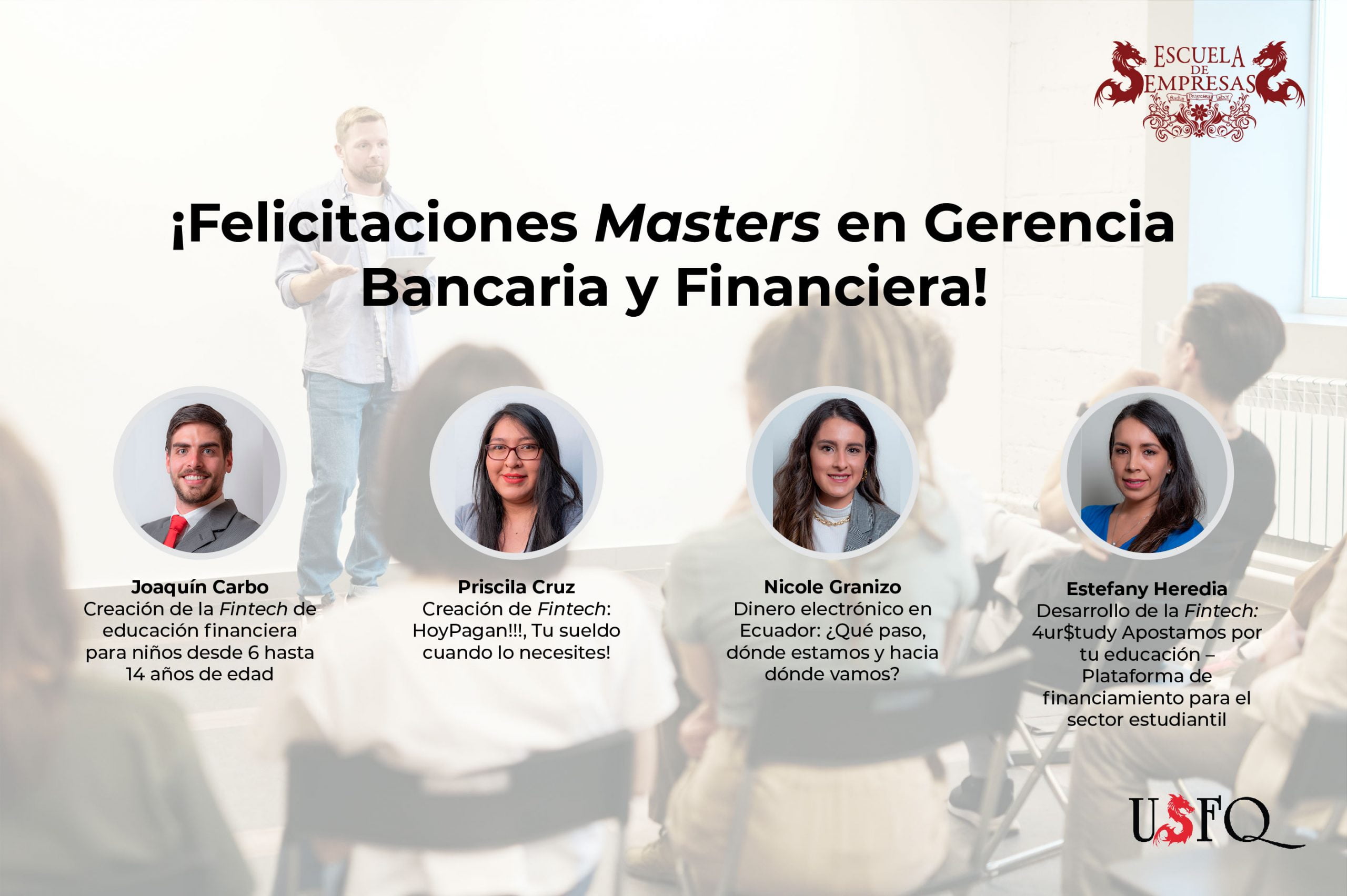 Los alumnos de la Maestría en Gerencia Bancaria y Financiera presentaron sus trabajos de titulación el pasado martes 10 de mayo frente al tribunal de grado conformado por Ana María Novillo, directora de Escuela de Empresas USFQ, y Carlos Córdova, director de tesis de la Maestría en Gerencia Bancaria y Financiera.