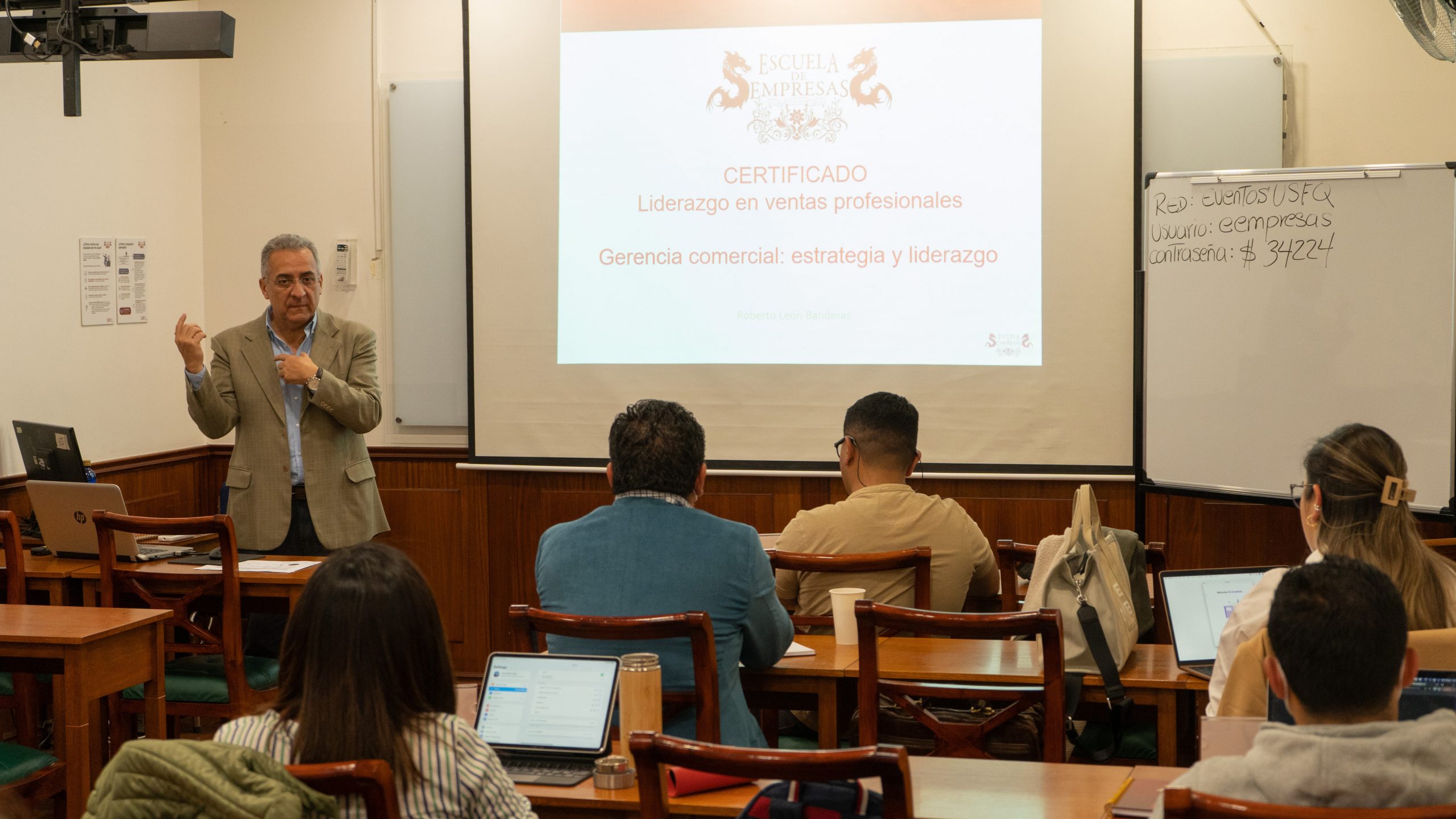 Escuela de Empresas USFQ dio inicio a un nuevo ciclo del Certificado liderazgo en ventas profesionales, un programa que permite a sus estudiantes desarrollar una visión táctica y estratégica de la función comercial dentro del marco de las ventas consultivas. Esta meta será cumplida gracias a la guía de Roberto León, Antonio Mendoza, Pablo Pérez, Fabián Garzón, Juan Pablo del Alcázar, Manuel Urías, Santiago Castro, Juan José Espinosa de los Monteros, Olga Cavallucci, Cristina Crespo, Cindy Hugo y Giovanni Rosania.