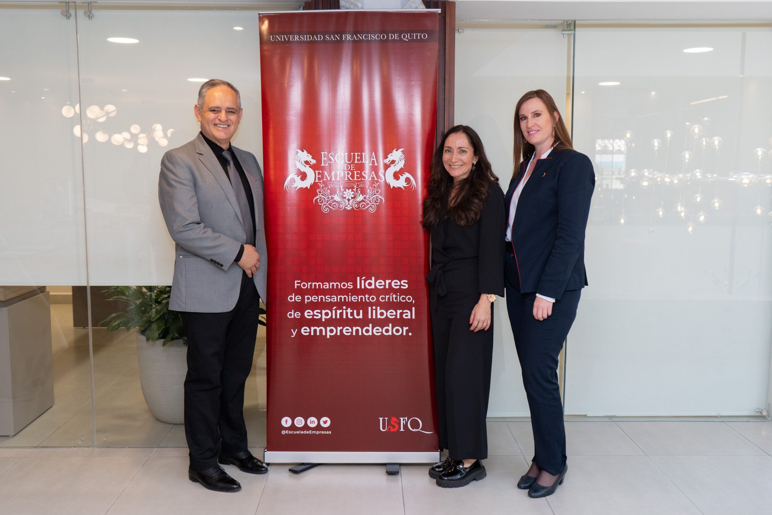 Esta enriquecedora alianza se oficializó el pasado jueves 26 de octubre en las instalaciones de la reconocida institución. Este importante evento contó con la presencia de María Antonieta Jaramillo, directora de educación empresarial de Escuela de Empresas USFQ, Guillermo Talbot, presidente ejecutivo y Clemente Tamariz, vicepresidente ejecutivo del Banco del Austro.